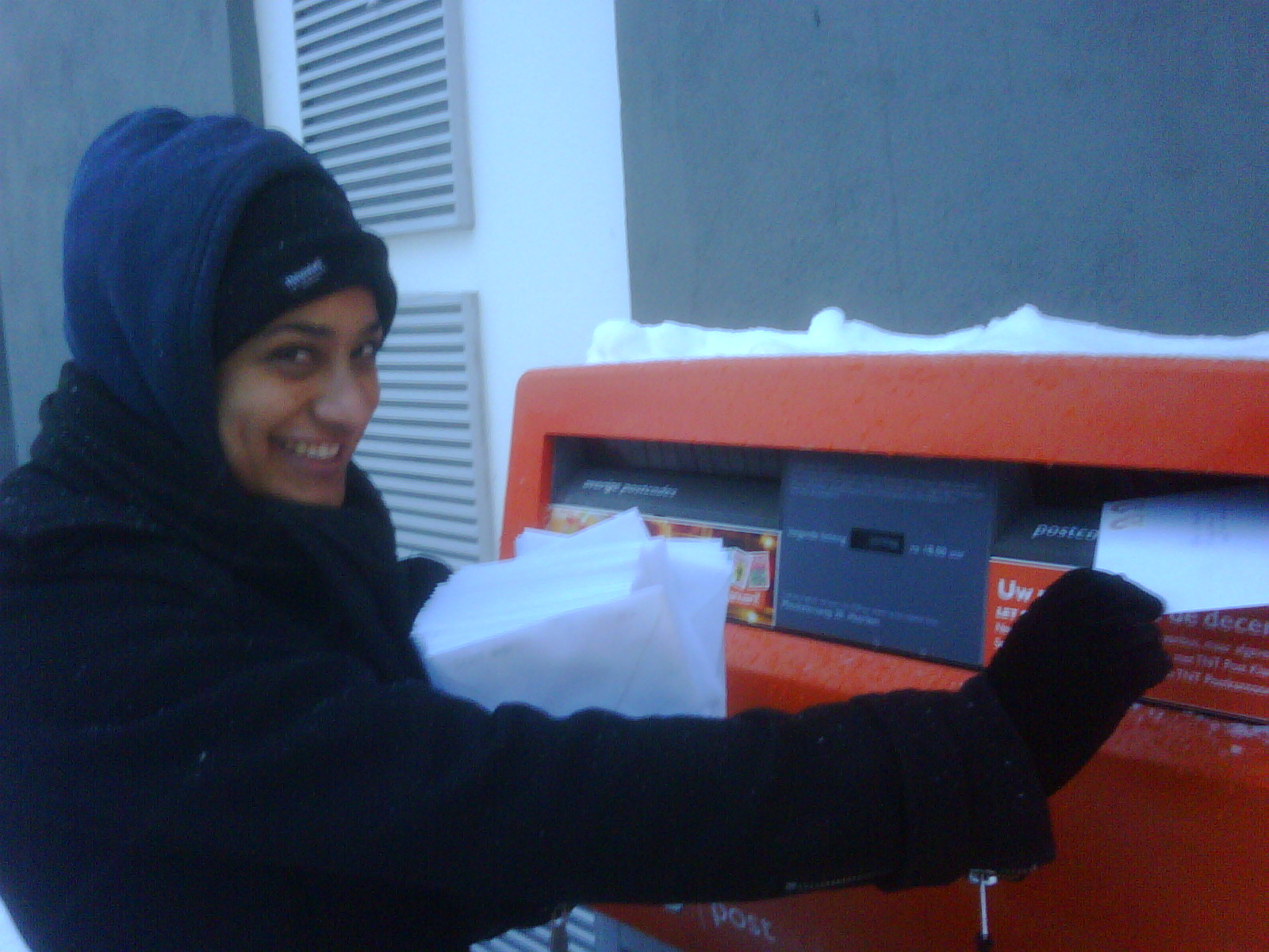 Het was weer lekker koud vandaag (zoals je kan zien :-)), maar dat kon ons er niet van weerhouden om de eerste uitnodigingen op de post te doen. De eerse 182 uitnodigingen zijn nu weg… nog een paar (kleine 75) te gaan en dan hopen dat iedereen komt. Het grappige is dat we begonnen met het idee om een feestje te geven met maximaal 100 man, maar goed… je begint namen op te schrijven en voor je het weet zit je gewoon op zo’n kleine 500 namen. Vrienden, familie en collega’s… dat gaat best wel snel. Maar om eerlijk te zijn vinden we het te gek om ons feest en ons geluk met zoveel mogelijk mensen te vieren!